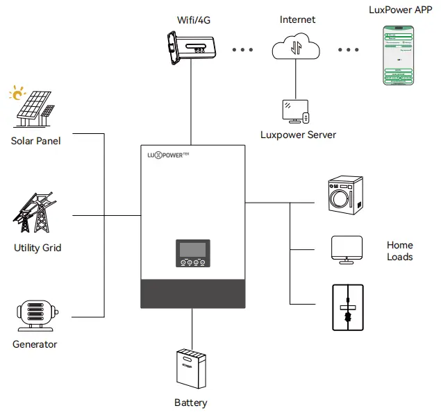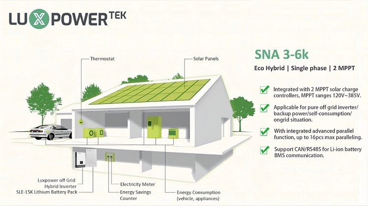 อินเวอร์เตอร์ Off-Grid ของ LuxPower SNA6000 รองรับระบบแปลง DC-DC ซึ่งทำหน้าที่เป็นพลังงานสำรองที่เชื่อถือได้หรือการเปลี่ยนเครื่องกำเนิดไฟฟ้าดีเซล ด้วยฟังก์ชันการทำงานแบบขนานความจุของระบบจะเพิ่มขึ้นจาก 6kW ถึง 96kW อินเวอร์เตอร์รองรับโหมดการทำงานของตัวแปลง DC-DC: